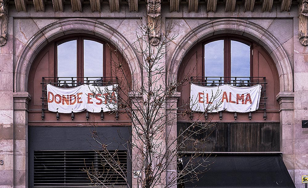 He aquí un buen ejemplo de lo que la fotografía puede hacer al seleccionar la realidad. La foto muestra una fachada de un edificio, unos soportales encima de un restaurante enfrente de uno de los mercados más famosos de Barcelona. A la derecha de lo que se observa en la imagen, pero ya fuera de cuadro, aparecía el resto del mensaje en otra tela blanca con idéntica tipografía: “ del Born”. Es decir, que lo que reivindicaba la pancarta era que el barrio del Born, con la nueva remodelación realizada en él, con el mercado y su conversión en zona museística-arqueológica, había perdido las esencias de lo que antaño tal vez mostrara. En cualquier caso, era una defensa de un pasado floreciente contraria a un presente modernizado o turistizado en exceso. Pero a mí ese mensaje me dejaba indiferente. Por lo menos, en ese contexto Y decidí recortarlo. La imagen resultante es la que el espectador tiene ante sí.