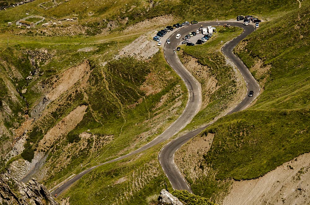 A primera vista, es sólo una carretera de montaña. Sus curvas se adaptan a la dificultad del terreno, mientras la senda va abriendo el camino sobre la mole montañosa que opone resistencia. Pero si uno se fija en los detalles, comienza a distinguir otros elementos: animales, coches, autocaravanas, un cercado, algún ciclista, algún caminante. Son habituales en el lugar donde se hallan. Lo que puede llamar la atención es el modo en que las líneas separan, unen, relacionan, distribuyen. Se podría haber tomado la fotografía desde otro ángulo, pero unos pasos más atrás, y las líneas dejarían de converger, desparramándose, formando otras divisorias; diez pasos hacia el otro lado, y el color se tornará más oscuro en su dominante. El verde podría haber sido el mismo, pero la amalgama de hierba y roca habría variado su composición, y el efecto visual variaría en esencia.