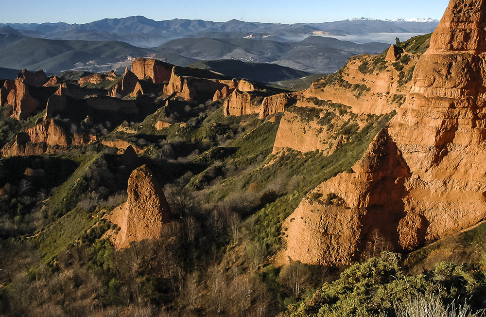 Este paisaje fascinante es el resultado de una actividad extractiva en tiempos de Roma y fue uno de los lugares más valiosos para el imperio romano. Se trataba de unas minas de oro, muy grandes, y además algo particulares. No había vetas claras, ni se hallaban en río alguno, sino que las pepitas se hallaban mezcladas de forma compacta con la arcilla y la arenisca. Ante la dificultad, la excitación ante la pureza de algunas pepitas logradas, los romanos, inteligentes, pero a quienes el uso de la fuerza no fue nunca ajeno, optaron por lo más fácil: derruir toda la zona, para entresacar por cribado posterior todo el oro posible. Optaron por lo más fácil, aunque supusiera una obra espectacularmente compleja. Es lo que entonces se denominó ruina montium, es decir, arruinar el monte en provecho del codiciado producto final. Se inyectaba desde arriba agua a presión en unos túneles excavados parcialmente, y la acción del agua por su gravedad hacía el resto, derribando paredes, resquebrajando las rocas blandas y aun las duras, hasta que todo aquel conjunto de derrubios, piedras y tierra, era capturado abajo del todo, donde los cedazos y los operarios separaban lo que no servía -la inmensa mayoría- de lo valioso -proporcionalmente menor-; con todo, se calculan unos cuantos miles de toneladas del preciado metal extraídos a lo largo de varios siglos. Como resulta lógico deducir, después de mucho tiempo de explotación exhaustiva, aquello quedó hecho una ruina, y nunca mejor dicho. Pero la acción de la naturaleza, creativa a veces, destructiva otras, modificó el resultado final, para modelar un paraje sorprendente de tierra rojiza mezclada con vegetación caducifolia que hoy calificamos de bellísimo, y que recientemente ha sido considerado Patrimonio de la Humanidad. Si en aquellos tiempos hubiera habido ecologistas, habrían tildado aquella mina de atentado brutal contra el medio ambiente, que sólo buscaba llenar los bolsillos del estado romano. Como se ve, todo puede ser relativo. Ya que el tiempo modifica en buena medida lo que opinamos sobre cada cuestión y la mirada que echamos en cada momento. Todo, sí. Lo modifica todo.