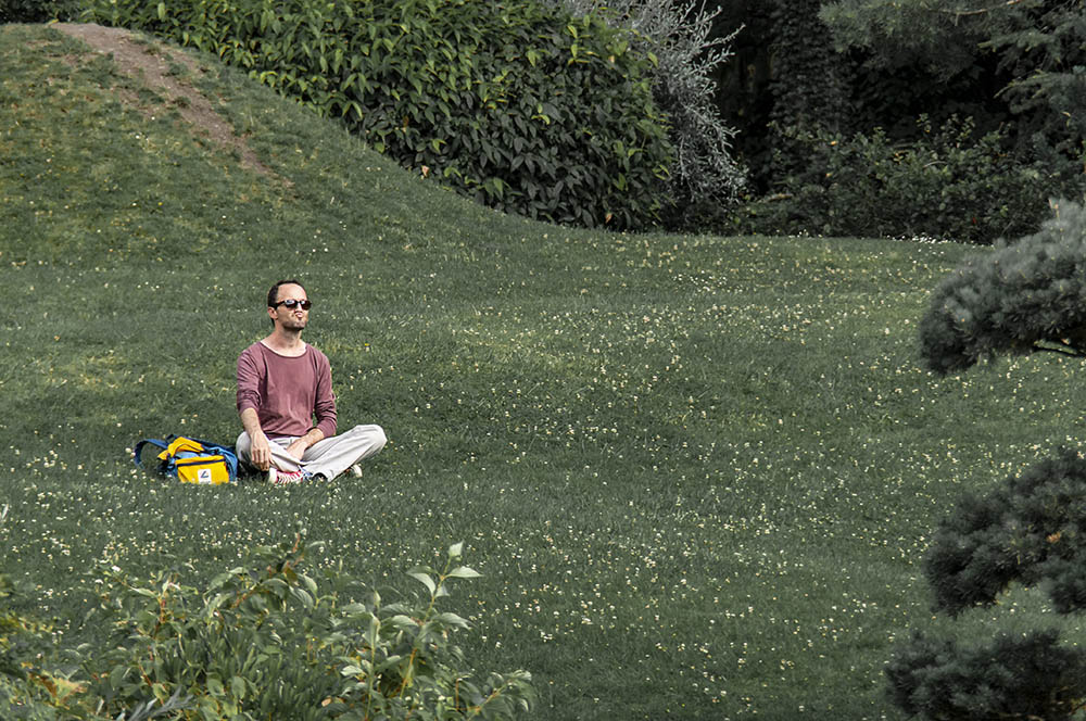 Debo desengañar a quien piense que este hombre solitario se encuentra practicando la meditación budista en unas colinas hindúes o birmanas. En realidad, se halla en un jardín urbano de Occidente. Eso sí, lo suficientemente grande como para que se haya colocado entre unos arbustos, suficientemente apartado de todos como para sentirse solo, separado de los demás. Ése es el objetivo que pretendía, y que como se puede comprobar ha logrado plenamente.