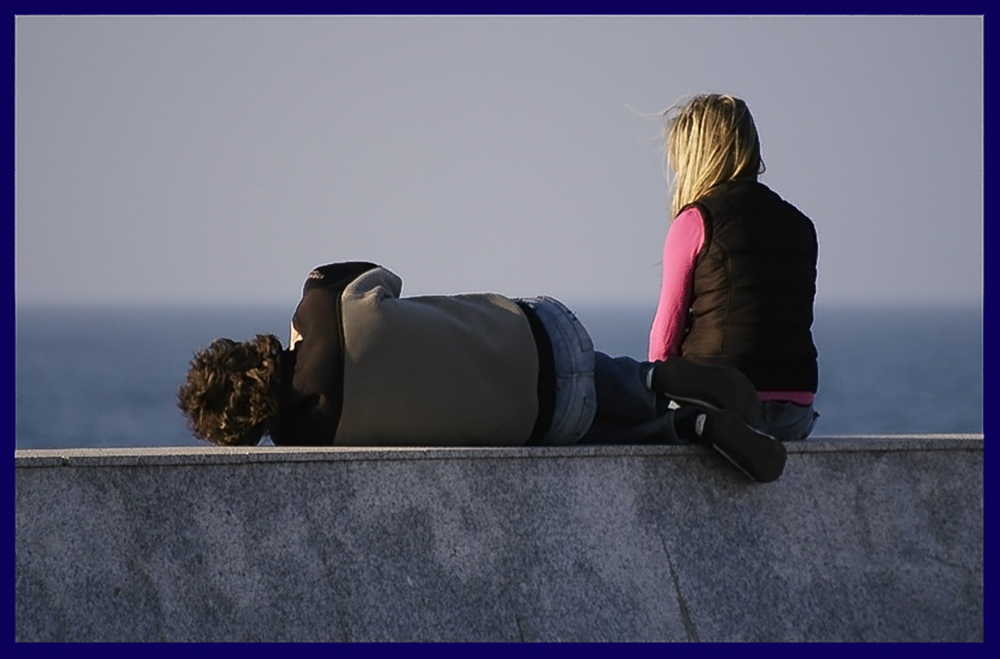 Caminaban lentamente, cuando el sol declinaba. Sus caras estaban serenas, pero serias. Sus manos no iban entrelazadas y sus cuerpos caminaban el uno al lado del otro, sin pegarse. Cuando llegaron a la rotonda, se sentaron sobre el pretil, frente al mar, dejando la gente a sus espaldas. Hablaron muy poco, apenas unas palabras de cada vez, en dos ocasiones. Luego callaron. Se dejaron arrullar por el rumor del manso oleaje y acariciar por el sol que iba bajando cada vez más. De repente, él se inclinó suavemente y se echó sobre su costado. Ella no se inmutó, y permaneció sentada como estaba, sin mirarle, con la vista perdida lejos, en el horizonte. Formaron de ese modo un ángulo recto, el único instante perfecto de una tarde -es de imaginar- bastante imperfecta.