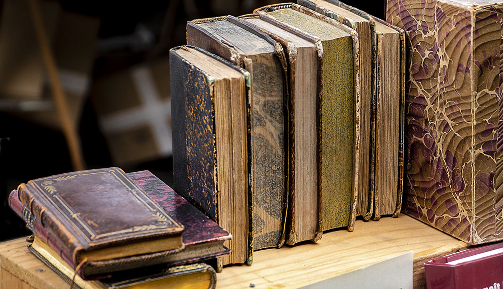 Y, pese a todo, cuando en los rastros o almonedas veo un montón de libros cuyas encuadernaciones estimulan un tanto la vista, no dejo de acercarme a ellos, y dejarme impregnar unos instantes de su olor, de sus vidas acumuladas, las propias y las de los propietarios que les traspasaron algo de las suyas también. Mis manos recorren sus lomos y su piel acaricia por un momento la mía. Mas no compro nunca ninguno. Sí suelo, en cambio, fotografiarlos si entreveo alguna composición que merezca la pena. No incorporan dichas imágenes el delicioso olor de sus años, pero al menos la vista se consuela con algo de recuerdo de un momento hermoso.