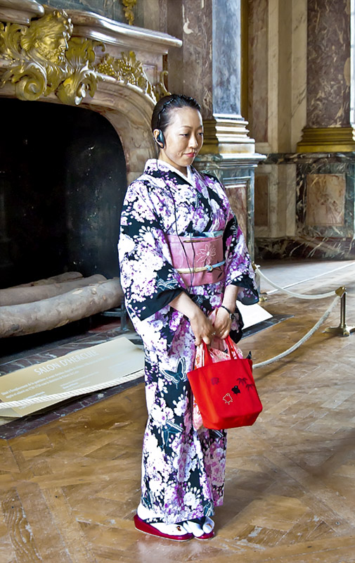 El tiempo del que dispondrán las dos mujeres es total, hasta la hora de la cena. Por eso, decide comenzar por uno de los palacios de mayor solera mundial, de fama planetaria, pues hasta ella, de origen humilde, ha oído hablar de él: Versalles. Se viste con sus mejores galas, pero decide que se sepa bien su procedencia, si es que su genotipo no lo comunica a primera vista. Un kimono de seda de doble forro, floreado, como corresponde a la estación, unos zapatos-geta y unos calcetines-tabi, cubren su cuerpo casi por completo, bien entubado con su rosáceo cinturón-obi, al que no falta tampoco por encima el embellecedor-obijime, a juego; no puede faltar su bolso-kago, aunque sea Louis Vuitton y de un color muy intenso. No lleva reloj, aunque tiene varias docenas en su casa (pues su marido viaja mucho, y tiene la autoculpabilidad muy desarrollada), pero no importa: tiene un iPhone 5, que le proporciona muchas herramientas, al que lleva conectados unos cascos último modelo de Sony, donde escucha música espiritual de Kítaro. No contenta con el efecto, saca su minúscula Nikon 1 y le pide a su madre que la retrate dentro del palacio de la realeza francesa. “Que se sepa bien dónde estuvimos —afirma convencida con el gesto resuelto—, que los que nos rodean ya saben dónde estamos ahora”.