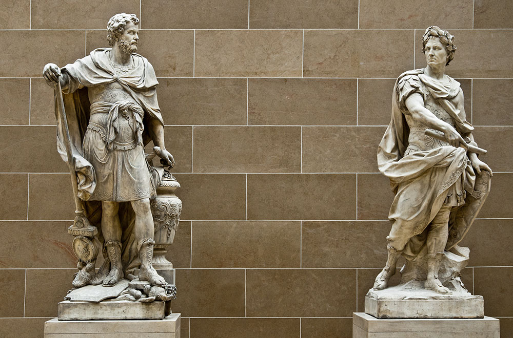 En esta imagen, tomada en un museo, ambas esculturas comparten espacio. A la izquierda, el cartaginés, orgulloso de portar boca abajo uno de los estandartes romanos que sus tropas capturaron, y de pisotear el águila romana. A la derecha, más comedido, un César laureado y bastón de mando, con la toga sobre la armadura, parece hacerse a un lado. ¿Quién sabe de quién sería la idea de colocar ambas obras juntas, a apenas unos metros de distancia? ¿Buscaría, acaso, un diálogo entre los muertos? Tal vez se comunicaran secretos de combate que únicamente ellos poseyeran. Puede que sólo se felicitaran mutuamente, rindiéndose admiración mutua de compañeros de armas. Acaso César le agradeciera la misteriosa decisión de dejar vivir a Roma cuando la tenía a su merced, aunque igual, asaltado recurrentemente por la duda, le preguntara las causas de tan inexplicable decisión. Acaso dialoguen. Es posible que se estén retando. O incluso cabría la posibilidad que su gesto petrificado nada signifique, y que la combinación de sus gestos sea producto del azar de unos técnicos de museos que buscaron el modo de suscitar la historia-ficción; o, tal vez, que no tenían ni puñetera idea de historia