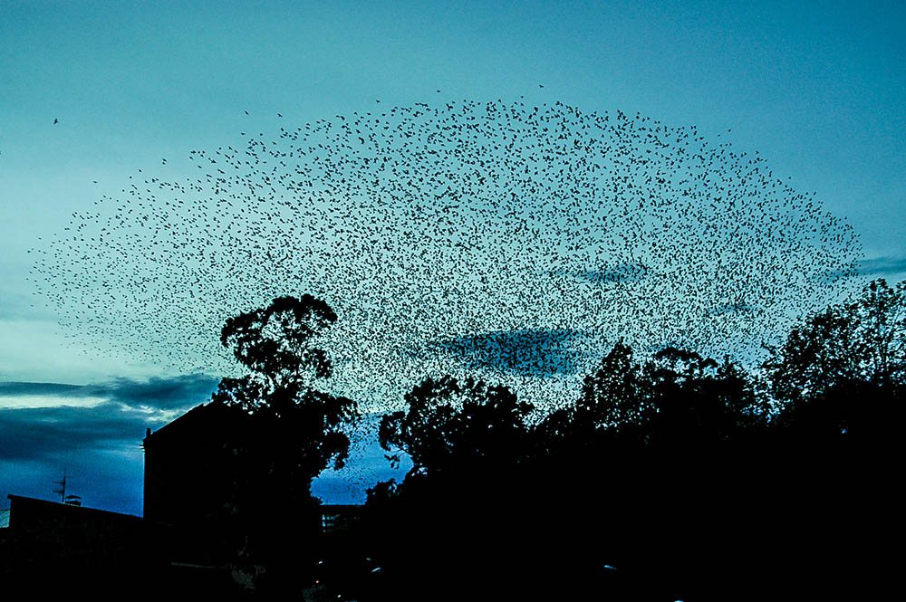 El caso opuesto, sería el del águila, la individualidad pura, cuyas decisiones pasan por su propia necesidad, adecuada a sus circunstancias. Pero hoy no hablamos del águila. Hoy hablamos de unas aves que, al igual que los cardúmenes de sardinas o arenques, se mueven al unísono, con una sorprendente habilidad de vuelo, dando a mayores la impresión de que son un cuerpo grande compuesto de pequeños cuerpos que le dan volumen y apariencia. Alguien podría aducir que es justo lo que es el águila: un conjunto de células que actúan a la vez para proporcionarle sus cualidades, que usará para satisfacer sus necesidades. Pero yo digo que no, que no es lo mismo, ni es igual.