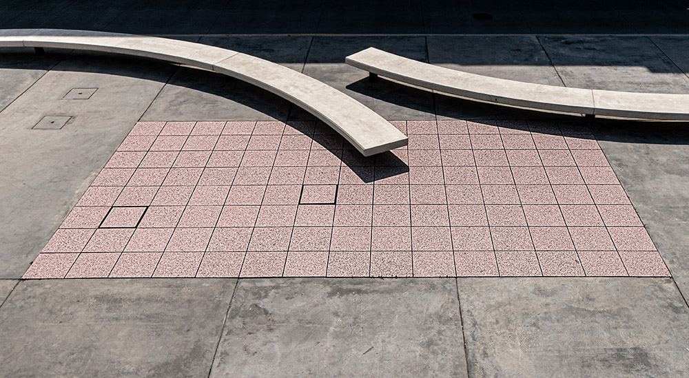 Desde lo alto de la Grapa (pasarela que une la parte urbana de Avilés con el Centro Niemeyer) fue tomada esta imagen que combina en la composición las curvas de los bancos corridos con las rectas de las cuadrículas en damero de las baldosas del suelo de la Antigua Plaza del Pescado. En la edición se añadió color al rectángulo de baldosas, como contraste añadido