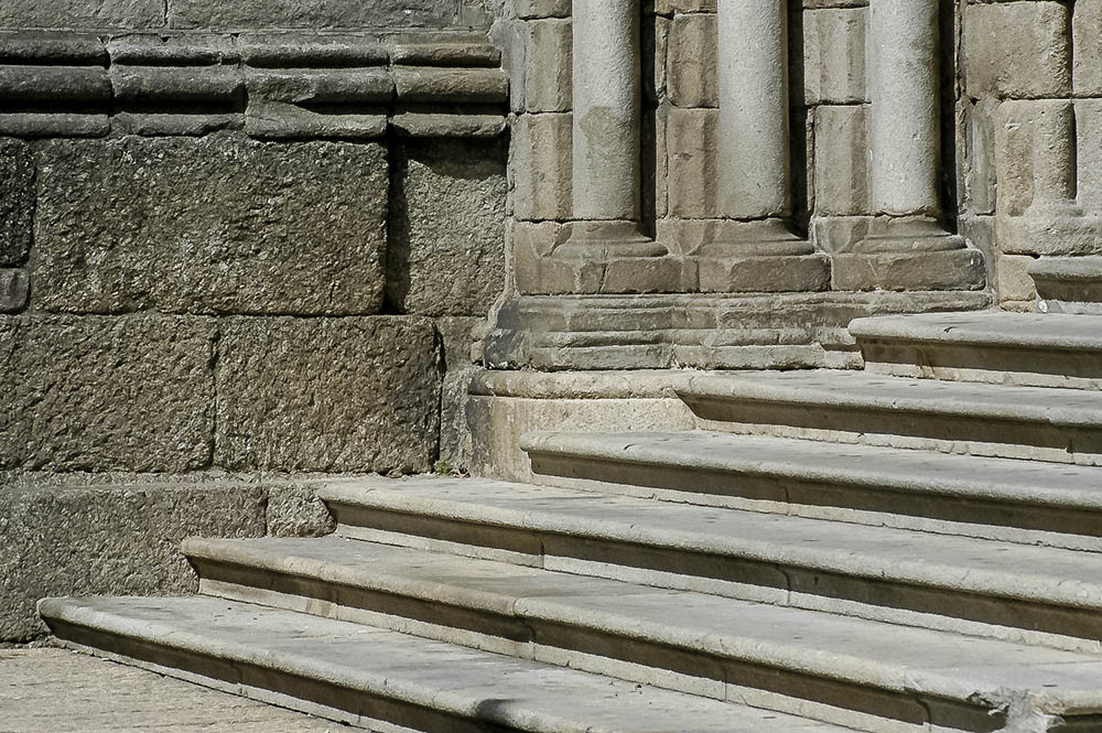 Detalle del acceso principal a la Catedral de Braga, con parte de las escaleras, el muro y las columnas adosadas de la portada. Es un ejercicio de líneas y ritmos, sin más. Selección y encuadre. Para gustos. Mínima edición