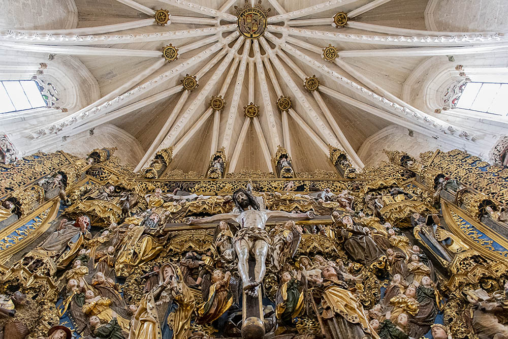 Contrapicado extremo del impresionante retablo de la Cartuja de Miraflores (de Gil de Siloé, con dorados de Diego de la Cruz, provenientes del primer oro traído de América). Aunque no se aprecia la originalísima rueda angélica sobre la que se enmarca el Crucificado, sí se puede ver la gran cantidad de figuras que pueblan esta joya de la escultura polícroma en madera. Sobre el mismo se ven en magno ensamblaje las bóvedas estrelladas de la cabecera de este magnífico templo de una sola nave. Todo de la misma época. Todo del gótico final, también llamado isabelino, de finales del XV a principios del XVI. La unidad de estilo lograda por la cercanía en el tiempo de escultura y arquitectura es lo que logra que la impresión sea tan unitaria y tan excepcional. Mínima edición