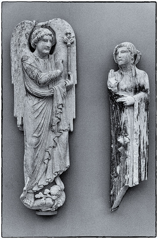 Este grupo estatuario en mármol de finales del s. XII proviene de un edificio sin identificar donde formaría parte de una portada que sería reemplazada en el silgo XVI. Representa la clásica Anunciación, con el Arcángel Gabriel portando una una flor de lis (símbolo de pureza y virginidad) transmitiendo su mensaje a María, que lo acepta con sumisión. Los entendidos aprecian afinidades estilísticas con el taller de la Daurade. Las figuras son muy verticales y rígidas, probablemente por adecuación al marco donde se hallaran, aunque el modelado de las caras y el tratamiento de los paños ya denota el momento final del románico. La edición ha convertido la imagen a B/N, aumentando un poco la textura y el grano