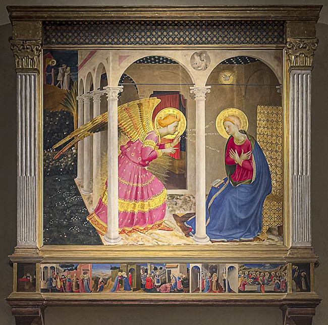 La joya del Museo Diocesano de Cortona fue la segunda Anunciación pintada por Fra Angelico que contemplaba por fin, tras la más conocida del Museo del Prado. Obra casi cuadrada, pintada en 1433-1434 con temple sobre tabla, muestra el característico tema bíblico, con un arcángel más serio y hasta amenazador, por la postura de sus manos. El conocido esquema en dos planos, como en las restantes versiones del mismo autor, es aquí más colorido, por los tonos de los ropajes, resulta impactante en su contemplación. Mínima edición