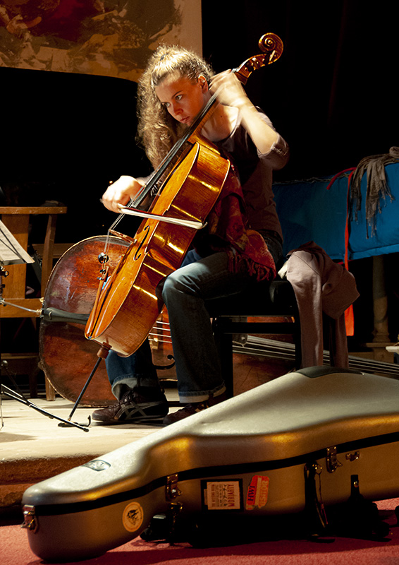 Uno entra de mañana a contemplar las maravillas arquitectónicas y escultóricas de una iglesia, y se encuentra, a mayores, un ensayo para un concierto que tendría lugar por la tarde. Un rato delicioso, entre Bach y Boccherini, amenizado por un quinteto de cuerda mixto, pero mayoritariamente femenino. Cuando todos hubieron acabado sus respectivas partes conjuntas o individuales, la violonchelista se quedó a repetir unos pasajes que no le debían parecer bien rematados. Una delicia, insisto. En la edición se eliminó un atril sobrante y se enfocó más su rostro, muy concentrado y expresivo