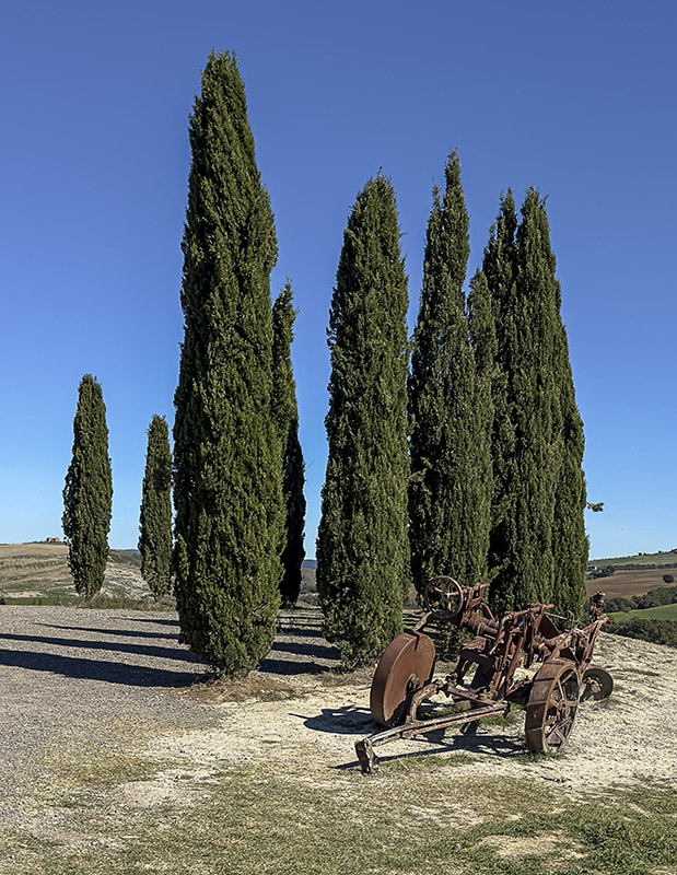 Al famoso conjunto de cipreses próximos a la localidad de S. Quirico d'Orcia se puede acceder desde dos puntos. Uno, la carretera principal; y otro, a través de una finca privada que permite el acceso sólo andando o en bici. En esa finca, también hay instrumentos de labranza, que en este caso, pude incorporar a la composición con estos árboles míticos, hermosos e inolvidables. Mínima edición