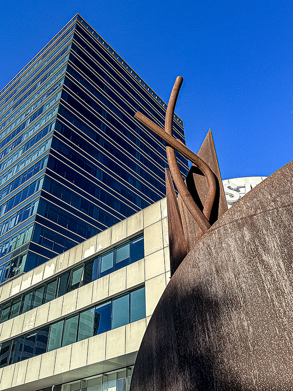 El complejo conocido algo ampulosamente como "World Trade Center", en el Puerto del Buceo de la capital uruguaya, alberga los más modernos edificios e incluye un paseo de esculturas contemporáneas abstractas, de gran importancia. En este caso, un edificio no excesivamente alto, pero totalmente acristalado en su torre superior sirve de fondo a la escultura de Carlos Atchugarry "Velas del sur", realizada en acero cortén. Un hermanamiento sabiamente dispuesto. Mínima edición