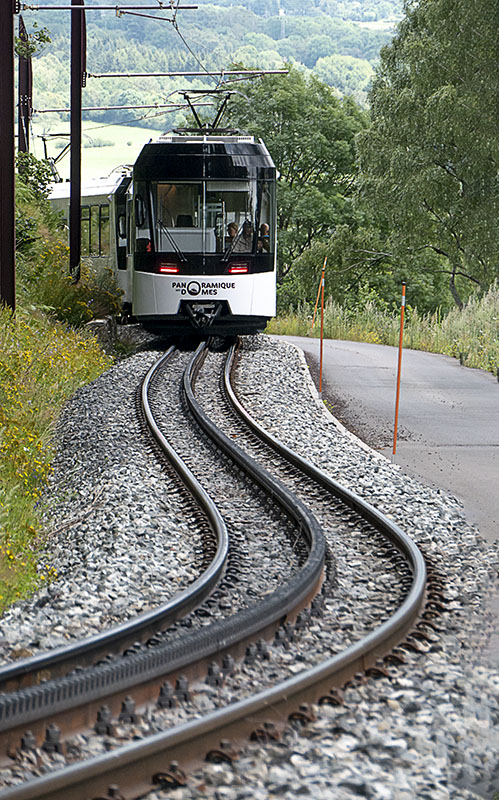 Uno tiene la idea de los trenes cremallera como si fueran algo del siglo XIX, y lo cierto es que sólo conservan de entonces el mecanismo que les da nombre. En todo lo demás, semejaría un tranvía eléctrico de cualquier ciudad moderna. Este que aquí se muestra efectúa el recorrido hasta las inmediaciones de la cima del Puy-de-Dôme, el más famoso de los volcanes apagados de esta verde región francesa. Mínima edición