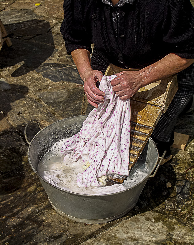 Esto era una exhibición de trabajos, tareas y objetos de antaño, en unas fiestas de Taramundi. Pero no están tan lejos los tiempos en que veíamos a nuestras madres y abuelas (los hombres al lavado ni se acercaban) realizar dicho menester en nuestros pueblos y en algunas ciudades también. El balde, la tabla de lavar, el jabón de sosa, agua y un lavadero donde aclarar -o el río más cercano- eran los elementos que concurrían en tan gravosa tarea. Yo mismo vi cómo crecían los sabañones de mi madre realizándola, sobre todo en el pueblo, y en invierno, cuando la matanza. Mínima edición