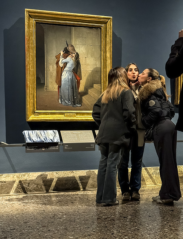 Mientras los viejos descansamos sentados de la brega de un museo muy intenso, donde hay mucho que contemplar, la muchachada contempla poco, pero se divierte mucho, y cuando llega a las inmediaciones de "El beso" de Francesco Hayez, lo que hacen la mayoría es una foto besándose, bien de a dos, que es lo más habitual, o bien en trío, como en este robado que capturé donde menos lo pensaba. ¡Ah, la juventud! Cuánta inanidad, cuánta diversión. Mínima edición