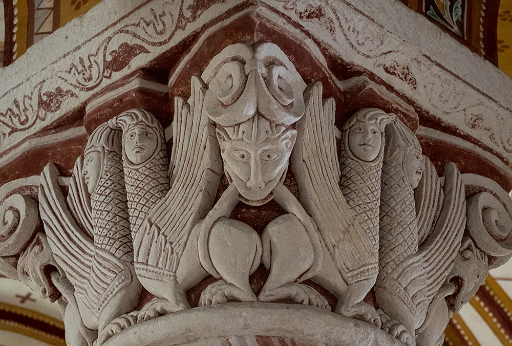 Algunos de los capiteles del presbiterio de la iglesia abacial de Saint Pierre, en Chauvigny (s. XII), son de los más conocidos del arte románico general y francés en particular. A pesar de que hay un capitel historiado (con la Epifanía, Anuncio a los pastores), la mayoría hacen referencia a los castigos que esperan a los pecadores, donde se hace gala de una particular estética al mostrar los monstruos que aguardan en el infierno. Aquí se muestra uno de los menos "agresivos", abundando en las ideas de la simetría estructural y la generación de seres híbridos, quiméricos. Mínima edición