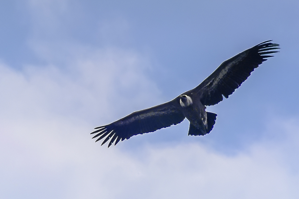 Un buitre leonado en plena ascensión por las corrientes de aire mañaneras, corona el cielo primaveral del Duratón. Con las alas desplegadas, alcanza una envergadura cercana a los 2'5 m, y su extraordinaria vista le capacita para detectar carroña a muchísimos metros de distancia. Su figura resulta inconfundible en estos pagos. Edición de aclarado de las sombras, dado el alto rango dinámico entre las partes de la foto