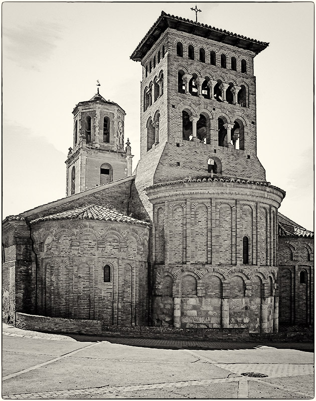 Es muy difícil contemplar la magnífica cabecera de la principal iglesia románico-mudéjar de Sahagún (s. XII), sin la presencia de coches en su derredor. Ese es el principal mérito de esta foto. El triple ábside recorrido por bandas y arquillos ciegos que aligeran su aspecto, fue construido en ladrillo, como casi toda la estructura de la iglesia. El cimborrio, de gran esbeltez, es una torre cuadrangular que sirve de campanario y no tiene comunicación con el interior. Se transformó el original, pasándolo al B/N y virándolo ligeramente al selenio, para acentuar la sensación de antigüedad del monumento
