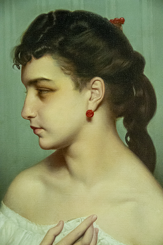 Un rostro de perfil, que sin mostrar excesiva belleza nos capta por el tratamiento de la piel, la dulzura del gesto y la composición serena, clásica, en la mejor tradición de los retratistas franceses del XIX. No en vano fue discípulo del neoclásico Ingres. Este óleo fue presentado en París en 1869. Mínima edición