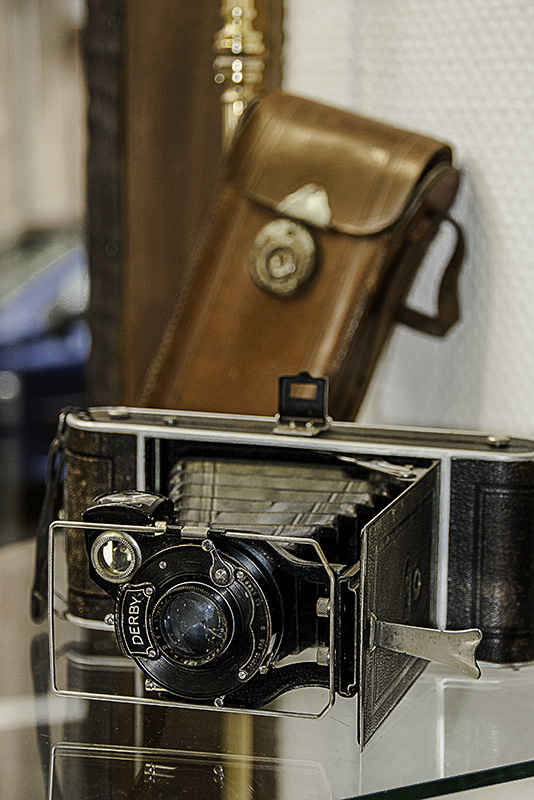Las cámaras de fotos antiguas -sobre todo los aparatos primitivos de fuelle- siempre llaman la atención por su belleza intrínseca, aunque sus prestaciones estén a años luz de las actuales. Se ven muchas en los rastrillos y mercados de antigüedades. Si además encuentras una con su funda original, el hallazgo ya es notable. En este caso no se vendía: sólo servía de atrezzo de un escaparate de moda "vintage". Mínima edición