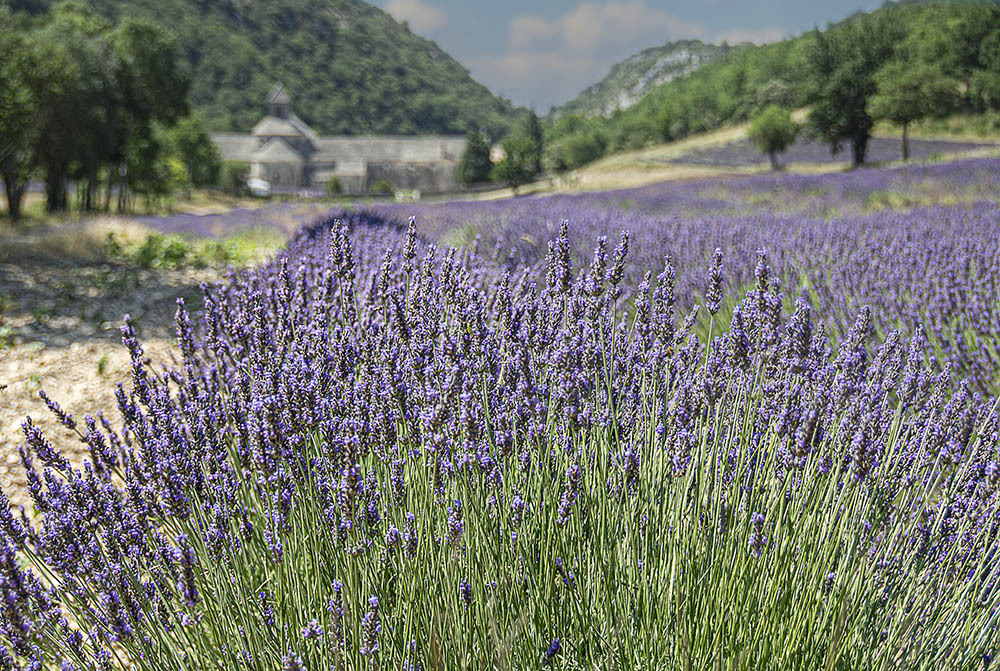 La Abadía de Sénanque no sólo es hermosa en sí como monumento, sino que se halla en una hondonada llena de hileras de lavanda que, si se llega en la época adecuada, y están floridas, son un espectáculo, como se puede apreciar en la imagen, que incluye la abadía desenfocada al fondo. Mínima edición