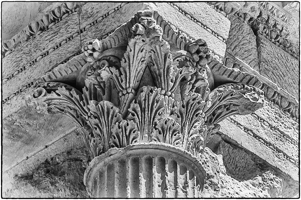 El arco de triunfo de Orange es uno de los mejores conservados de todo el territorio del imperio romano. Construido en piedra caliza sin mortero, es obra del siglo I. Aquí se muestra uno de los capiteles de las semicolumnas que lo decoran. Es de orden corintio. Conversión del original a B/N y adición de mayor contraste