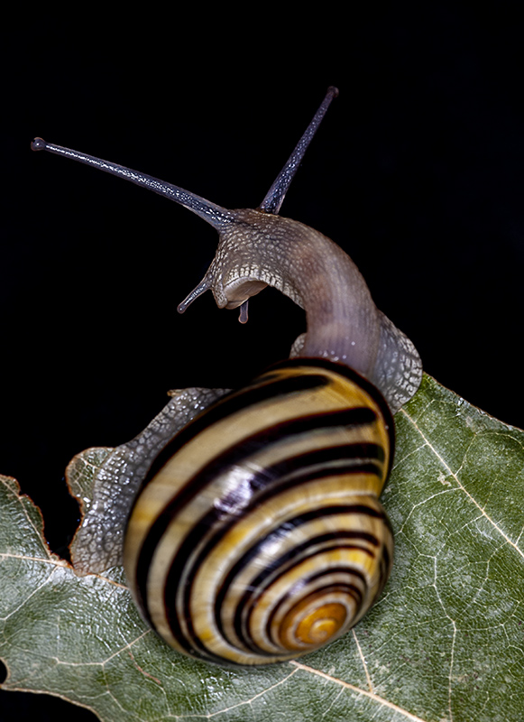 Macrofotografía de estudio de un caracol común, sobre una hoja que también me agencié para "crear ambiente". Flash de anillo. Mínima edición