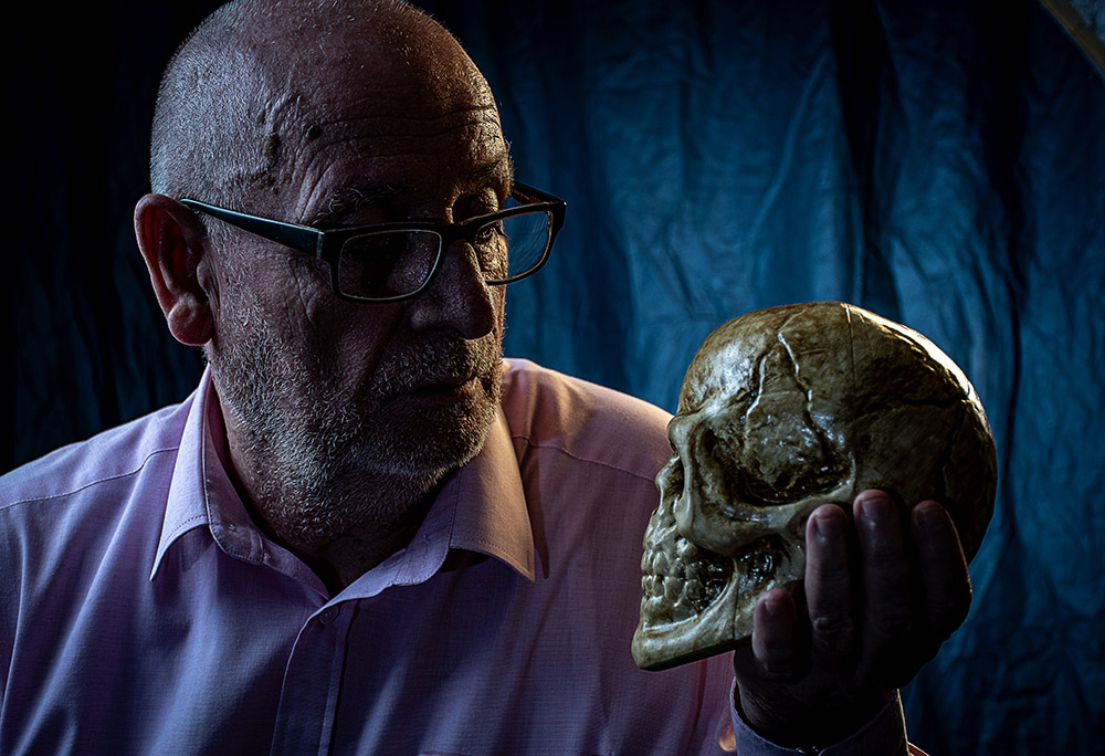 Mi buen amigo Carlos Sierra, escritor de imaginación apabullante, reputado dramaturgo de extrañezas y minorías, posando con la calavera de Yorick, emulando al personaje más famoso del Bardo, en una sesión de estudio memorable. Mínima edición