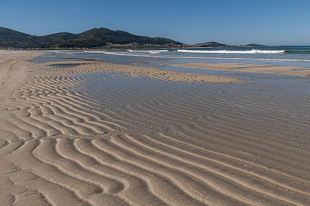 La larguísima, bellísima, y muy acogedora playa de Carnota es una de mis preferidas, y a las que más veces he regresado siempre que me hallo cerca. En este caso, las ondas que dejan las olas en la marea baja conformaban unos ritmos estupendos que guían la vista hacia el fondo, contrastando con la parte de agua, retirada lo suficiente como para darle a la arena todo el protagonismo. Mínima edición