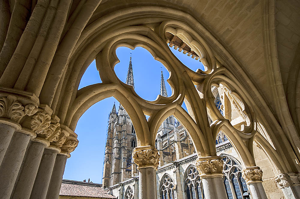 La catedral de Bayona se encuadra en el gótico clásico francés, el de la primera mitad del s. XIII (comenzada en 1213; claustro de 1240). No abundan las florituras que vendrían después, y su sobriedad salta a la vista. A través de una arcada del claustro, se ve el cuerpo principal del templo, con sus dos campanarios gemelos, que alcanzan los 85 m. de altura, y concluidos en el XIX, en plena fiebre historicista promovida por Vioellet-le-Duc. Edición correctora de las sombras del primer plano