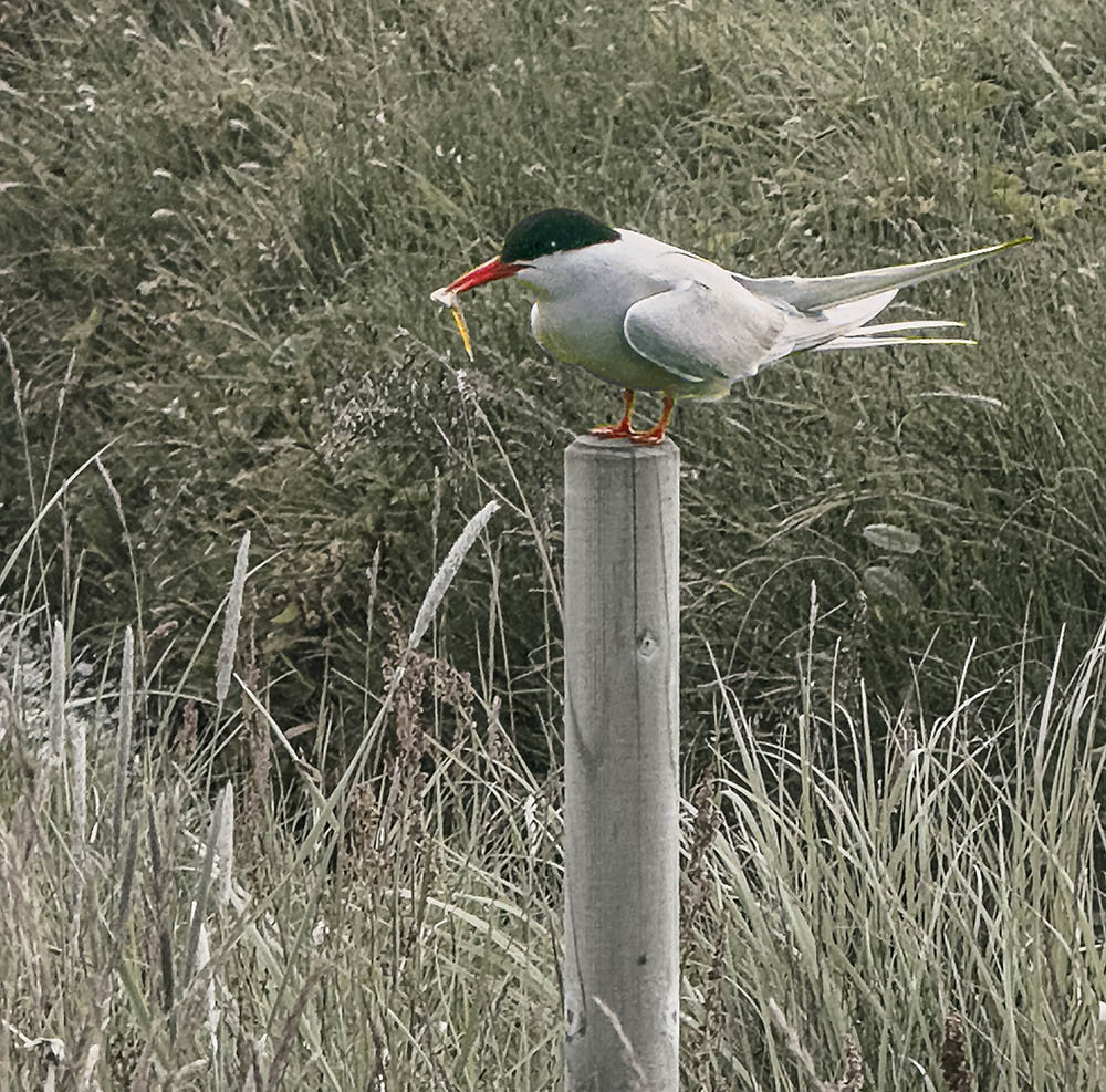 Abundan por toda Islandia, pero en el norte son más comunes. Los charranes árticos son unas aves que no muestran un gran tamaño, pero sus evoluciones aéreas son veloces y pescan con gran habilidad. En esta imagen se observa a uno de ellos, con un pececillo recién capturado, reposando en un poste tras el lance de pesca. Se desaturó un poco el color de la vegetación para que destacara un poco más