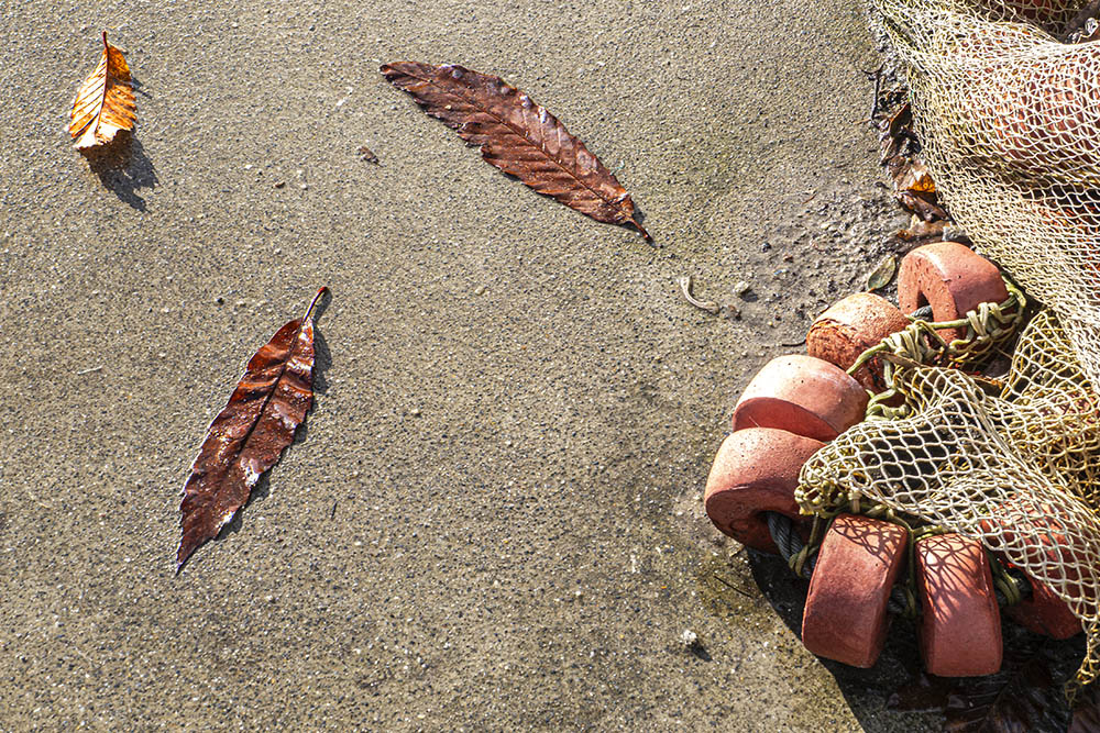 En la playa de Cabanas, frente al núcleo urbano de Pontedeume. Las hojas que aparecen ahí son de castaño. La red y los flotadores fueron depositados en la arena por la marea. Mínima edición