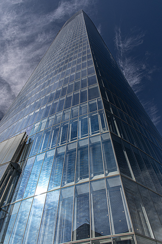 La muy alta y muy compacta Torre Iberdrola señorea desde 2011 el caserío bilbaíno con sus 165 m. Su autor fue el argentino César Pelli, que firmó también las Torres Petronas en Kuala Lumpur y el rascacielos más alto de España, la Torre de Cristal, en Madrid. El efecto de la imagen fue obtenido mediante un filtro polarizador. La edición posterior fue mínima