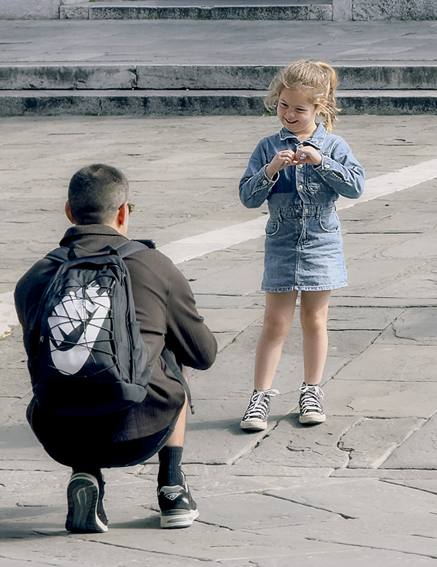 El título de esta imagen se puede justificar de dos maneras, y las dos son ciertas por completo. La cría hace frente a su padre el gesto del corazón con las dos manos que tan habitualmente estamos acostumbrados a ver hoy día. Pero es que, además, era un dulce de niña. Agradable, sonriente, alegre, curiosa, delicada en el trato... En fin, para llamar la atención entre las hordas de turistas, como de hecho me la llamó a mí. Por fortuna, su padre era tan pesado con el encuadre como lo soy yo, y eso me permitió tirarle varias fotos desde cerca, hasta conseguir una que mereciera la pena. Y todo, con la paciencia infinita de este corazoncito de niña. Mínima edición