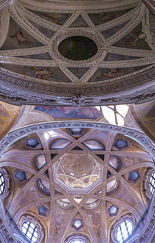 De parecida factura a la capilla de Santo Sudario de la misma ciudad piamontesa, Guarino Guarini muestra su habilidad para las estructuras abovedadas complejas, con profundas influencias de las cúpulas de nervios entrelazados de origen hispano-musulmán. Es obra barroca de finales del XVIII. Mínima edición