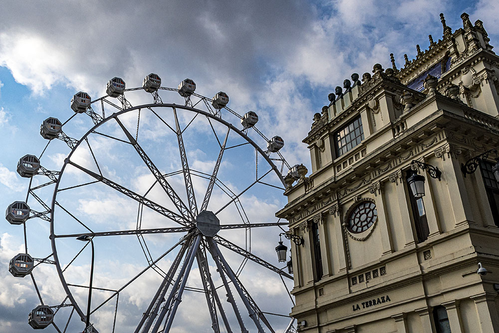 Contraste entre la estructura de la noria recientemente instalada en el puerto de La Coruña y el edificio que se halla enfrente, La Terraza, construcción modernista de 1920-22, que sustituyó a otro edificio, también modernista, que fue trasladado a Sada. Mínima edición