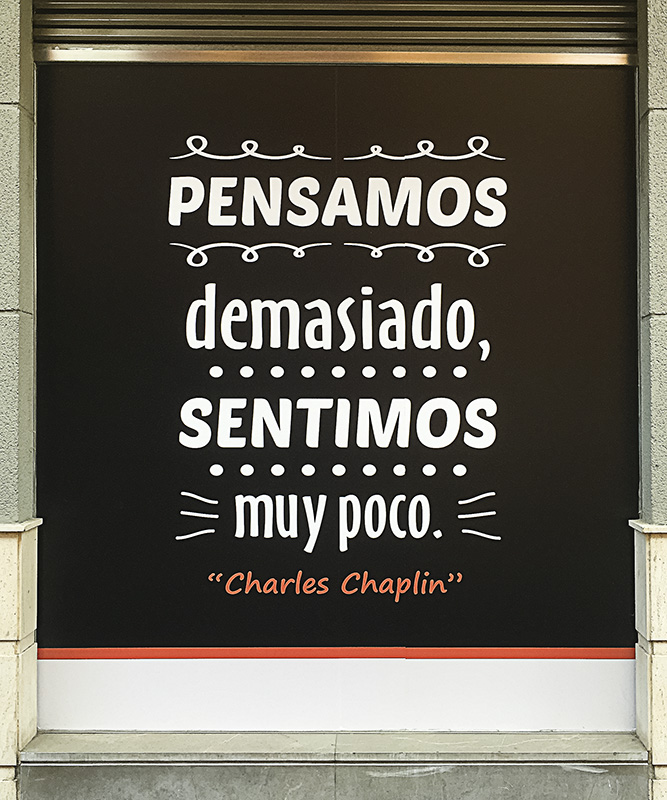 La cita de mi adorado Chaplin parece sugerente, pero en esta ocasión no acierta. Por desgracia, pensamos bastante poco y sentimos lo justito para andar tirando. De hecho, las últimas investigaciones en neurociencia revelan que solemos guiarnos más por los sentimientos que por el raciocinio. Por eso seguirnos llamando animales racionales me parece harto petulante. Edición de equilibrado de líneas verticales y horizontales