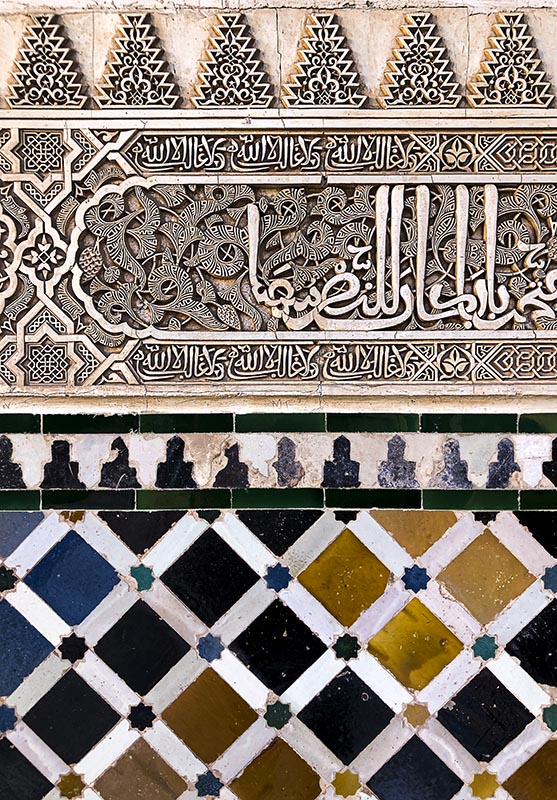 Las paredes de los palacios nazaríes de la Alhambra se hallan plagadas de decoración de materiales muy baratos (estuco, azulejos, ladrillo, yeserías), pero con un sentido estético único e impactante. En esta imagen contemplamos varios de esos elementos que ellos combinaron de manera tan particular: piñones en la parte superior y alicatados de cuadrados y estrellas en la inferior; en el medio, atauriques vegetales, lacerías y caligrafías coránicas, omnipresentes en una civilización de marcado carácter iconoclasta. Mínima edición
