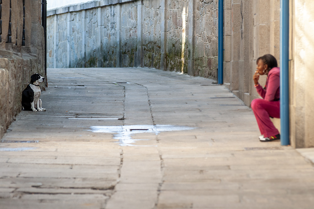 La mujer fuma, abstraída, sentada en el escalón de un portal. El perro, al otro extremo de la calle peatonal, la observa. No sabemos si desconfía de ella, de su color de piel, del color de su chándal, si se pregunta por qué no llama su atención, por qué están tan ensimismada, o qué. El rostro del perro está atento, pero no alcanzamos a adivinar el porqué de su posición, frente a la mujer, pero algo apartado. A mí me daría para un relato corto, sólo con imaginar una leve trama; pero éste no es el momento. Mínima edición
