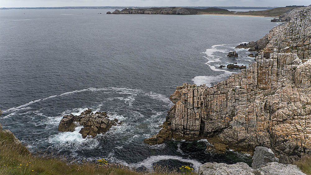 La parte más salvaje de Bretaña se encuentra al oeste, en el departamento de Finistère. Dentro del mismo, la península de Crozon ofrece lugares de geología extraordinaria. En la imagen se ve una zona costera, próxima a una playa donde se pueden contemplar las rajaduras de la roca (diaclasas) producidas en estratos levantados desde su posición horizontal hasta su verticalidad actual. Edición para fortalecer el enfoque y el contraste