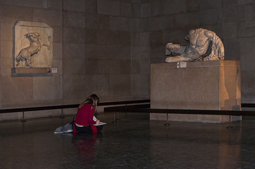 En la sala de los mármoles Elgin, sustraídos del Partenón, hallé a esta estudiante de Bellas Artes que se afanaba en lograr un buen ángulo contrapicado que supliera la diferencia de altura de la ubicación actual con la que en su momento tendrían en lo alto del famoso templo ateniense. La sala estaba habitualmente abarrotada, pero si se sabe esperar, a veces se consigue dar la impresión de soledad y silencio, aunque sólo sea una ilusión. Mínima edición