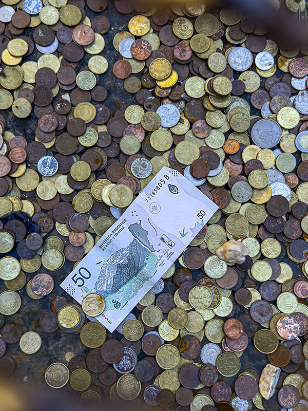 Ya no me acuerdo en qué pozo fue, si en un museo o en un pozo de una plaza. Vi esto tantas veces -y no sólo en Italia-, que ya perdí la cuenta de dónde fue. Sé que es San Gimignano, porque los metadatos del archivo me dicen que fue el día 7 de octubre a las 11'16. Pero nada más. Es otro de los exponentes de la cultura de nuestros tiempo: gregaria, neomitificadora, banal en definitiva. A mí me pilla muy lejos tanta tontuna, valga la aliteración. Eso sí, la inclusión del papel argentino sobre la marea de cuproníqueles me resultó interesante en la composición. Mínima edición