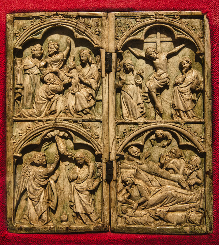 Expuesto en el multifacético Museo Bonnat de Bayona, este díptico de marfil fue concebido para ser transportado y servir a sus dueños de altar portátil en viajes y desplazamientos. No dispongo de datos de autoría y cronología, pero los relieves son claramente góticos, a pesar de los arcos escarzanos más propios del Renacimiento. Las cuatro escenas (Anunciación, Nacimiento, Epifanía, Crucifixión) utilizan la iconografía habitual en la época, y ofrecen una gran expresividad en tan reducido espacio. Mínima edición