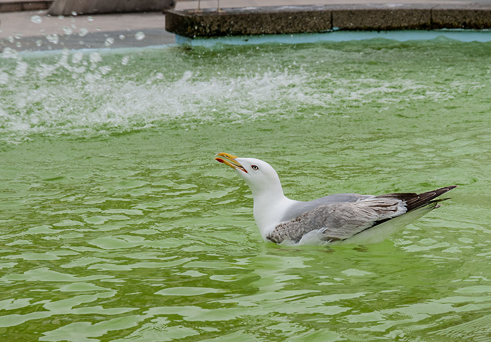 Las gaviotas son animales acostumbrados al contacto con el ser humano. Su desinhibición ha ido en aumento con los tiempos, y es natural verlas en cualquier circunstancia usando las ciudades y pueblos cercanos a la costa como asentamiento constante, cazadero recurrente y lugar de vida habitual. Este ejemplar que aquí se muestra procede a sus abluciones matinales en una famosa fuente del paseo marítimo coruñés. Mínima edición