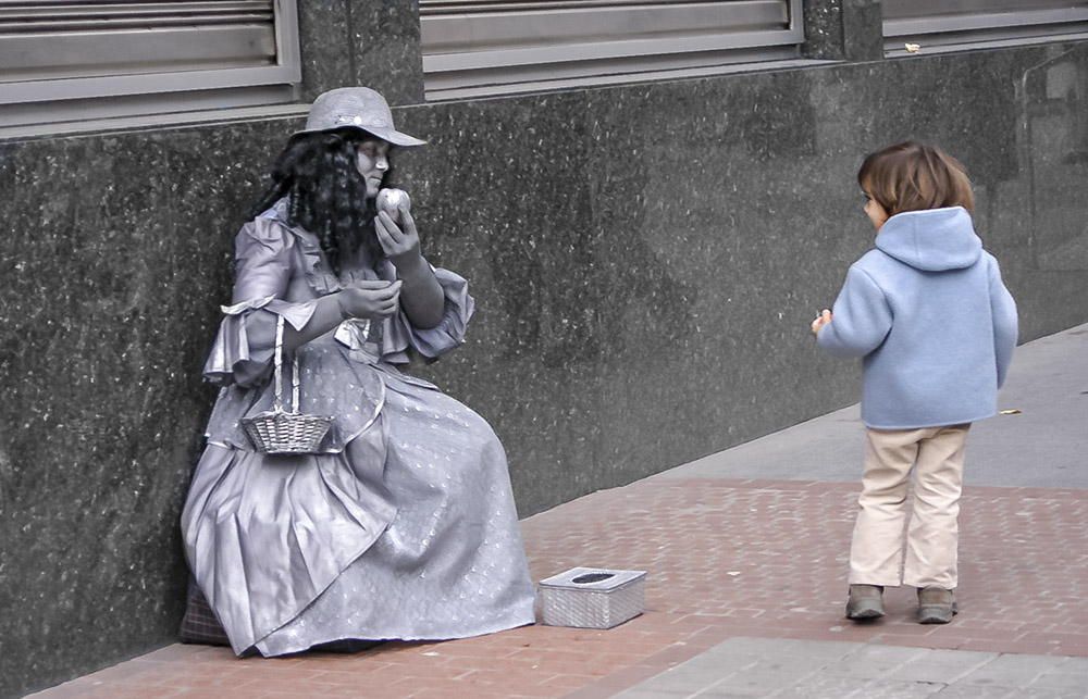La espontaneidad pura de los niños permite escenas tiernas que no se podrían dar con los adultos. En este caso, la chiquilla se sorprende por ver a la mimo disfrazada de un modo inusualmente monocromático para ella. Además, la artista callejera le ofrece la manzana como reclamo para captar su atención y que, de paso, sus padres se acerquen y... Lo interesante es el juego de miradas e imaginar lo que estaría pensando la niña en ese momento. Lo que pensaran los adultos es más fácil de prever. En la edición se desaturó la pared donde se reflejaban colores indeseados, y se potenció el enfoque en rostro y manos