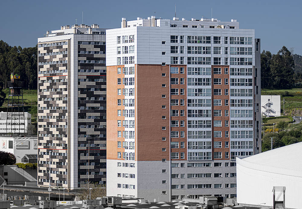 Dos de los edificios construidos en el polígono residencial de Someso, en entorno del centro comercial Espacio Coruña y el centro Coliseum. En primer término, la Torre Urbis VPO, de 17 plantas, construido en 2009. Su altura ronda los 60 m. Mínima edición