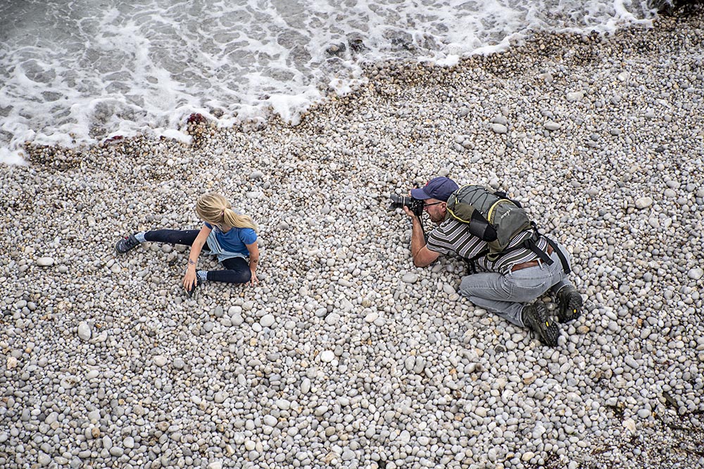 En la pedregosa y estrecha playa urbana de Fécamp encontré a este padre, empeñado en obtener una buena toma de su hija, que, en cambio, parecía algo distraída, o al menos preocupada porque las olas no llegaran hasta ella. La toma cenital en oblicuo y las líneas que se establecen entre los protagonistas, la espuma y la visión de voyeur de doble recorrido hacen el resto. Mínima edición