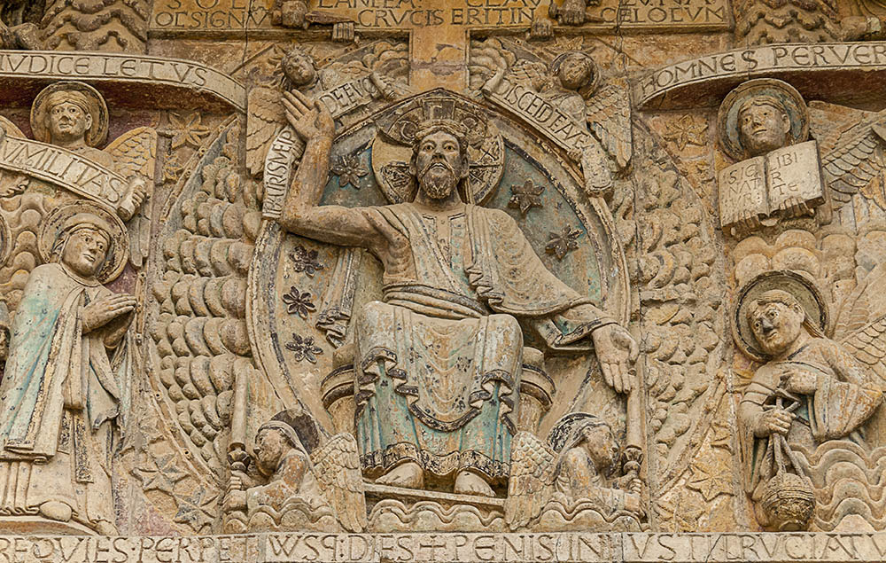 El tímpano central de Sta. Fe de Conques (obra cumbre del románico francés, s. XII) es soberbio por muchas razones, una de las cuales es la serena "humanidad" que muestra el rostro del Cristo, supremo Juez (Pantocrátor), con restos de policromía y en un estado de conservación admirable. Pese a no ir circundado del habitual tetramorfos (figuras simbólicas de los cuatro evangelistas) no faltan protagonistas en un semicírculo repleto de figuras que muestran los dos escenarios posibles en el Juicio Final, el Cielo y el Infierno. Mínima edición