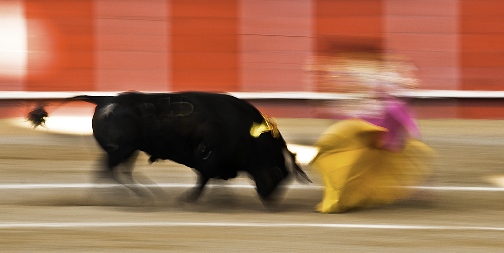 Las formas físicas en movimiento, si son captadas con una velocidad lenta, quedan ampliadas en su volumen y las formas se diluyen y se expanden. En este caso, la embestida de un toro en el primer tercio ha quedado más nítida, porque era esa forma la que mi zoom estaba siguiendo en movimiento; todo lo demás queda, lógicamente, movido en el sentido del barrido. Mínima edición